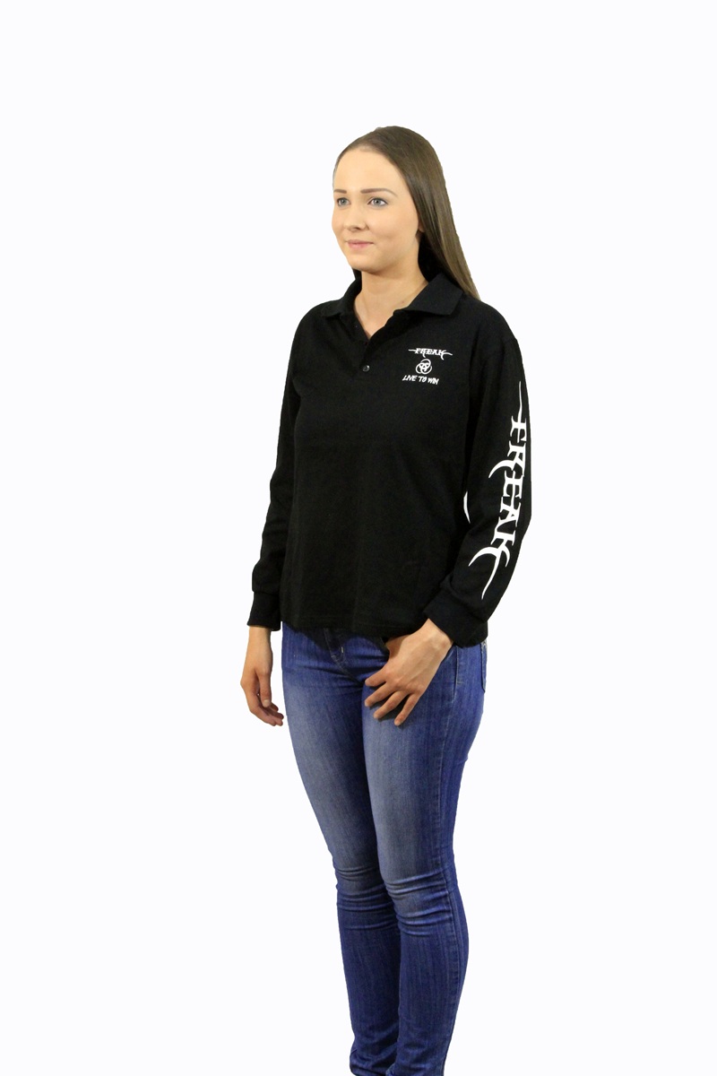Long Sleeve Black Polo with Pocket & Left Sleeve White Screenprint